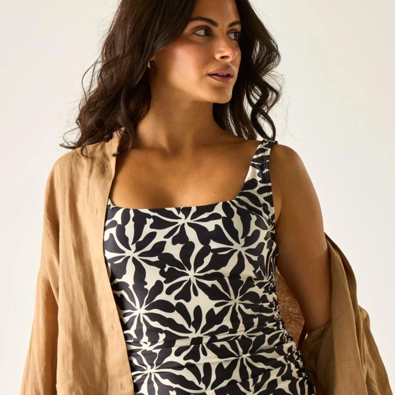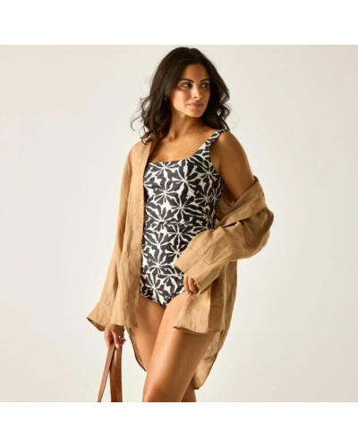 Női fürdőruha felső, csak felső, Prémium női alakformáló fürdőruha felső seersucker stripe textúra, állítható pántok, UPF 50+ UV-védelem, Ez a női fürdőruha 85% újrahasznosított poliészter / 15% elasztán összetételû, 200 g/m? súlyú rugalmas anyagból, valamint 51% poliészter / 33% poliamid / 16% elasztán seersucker stripe texturált anyagból készült, 230 g/m? kivitelben. A strukturált, formatartó szövet stabil illeszkedést biztosít, míg a hasformáló panel és az oldalsó ráncolás előnyös, nőies sziluettet eredményez. Az UPF 50+ UV-védelem segít csökkenteni a napsugárzás káros hatásait vízparti használat során., Főbb jellemzők:, 85% újrahasznosított poliészter / 15% elasztán stretch anyag, 200 g/m?, 51% poliészter / 33% poliamid / 16% elasztán seersucker stripe texturált anyag, 230 g/m?, Szögletes nyakkivágás, Merevítő nélküli, párnázott kosarak, Fix ráncolás az oldalvarrásnál, Hasformáló panel az előnyös illeszkedésért, Teljesen állítható vállpántok a stabilitásért és az egyéni illeszkedésért, UPF 50+ UV-védelem, Ajánlott: Női egyrészes fürdőruhaként ideális strandoláshoz, wellnesshez, nyaraláshoz és vízparti pihenéshez. Kiváló választás, ha fontos a biztos tartás, az alakformáló hatás és a modern, strukturált megjelenés., Fenntarthatóság: Az újrahasznosított poliészter tartalom csökkenti a környezeti terhelést, miközben tartós és formatartó konstrukciót biztosít. A minőségi kivitel hosszú távon megbízható viseletet garantál.