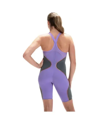 Details: Feel unstoppable wearing Speedo innovation, developed by swimmers for swimmers. The Fastskin LZR Pure Intent \'Purple Reign\' Closedback Kneeskin in Miami Lilac & USA Charcoal features compressive dual layers and ergonomic seam construction designed to connect key muscle groups for greater power return. Textured fabric zones target drag reduction so you get the very best from your swim, and the triple fabric construction with bonded seams has been designed to enable greater movement. The closed back offers greater coverage which can improve performance and may be preferred by swimmers with straight backs. This product has been fully approved by FINA. Features: Compressive dual layers and ergonomic seam construction designed to connect key muscle groups for greater power return. Triple fabric construction with bonded seams designed for greater range of movement. Textured fabric zones target drag reduction for optimal performance. Precision straps for enhanced comfort. Constructed with flexible zones to aid in getting the suit on FINA APPROVED
