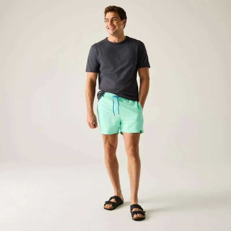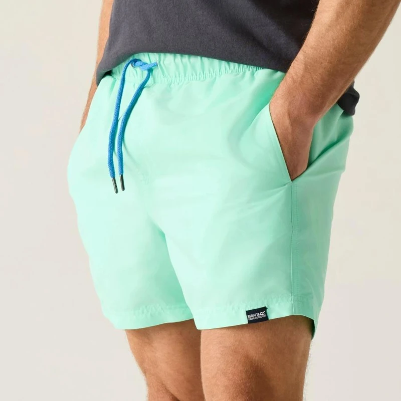 Férfi fürdő short, 100% poliészter taslan anyag, Gyorsan száradó anyag, Húzózsinórral állítható derékrész, Két oldal zseb, Egy farzseb, Rövid, hálós bélés, biztonsági zsebbel
