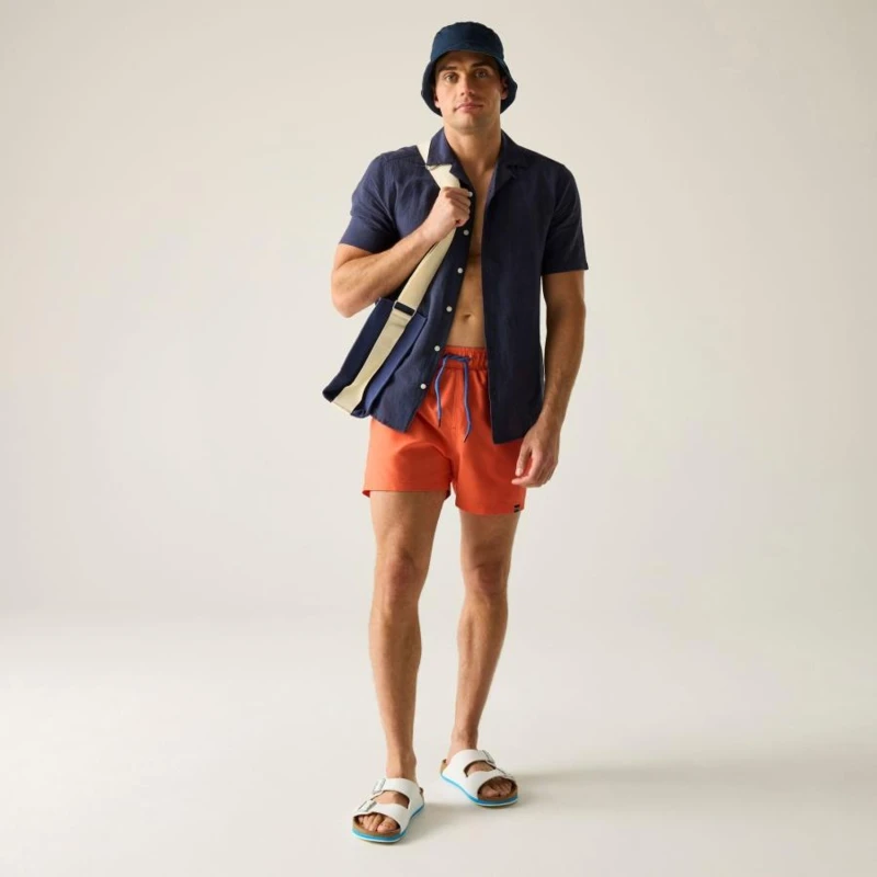 Férfi fürdő short, 100% poliészter taslan anyag, Gyorsan száradó anyag, Húzózsinórral állítható derékrész, Két oldal zseb, Egy farzseb, Rövid, hálós bélés, biztonsági zsebbel