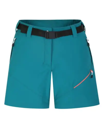 női technikai short, Könnyû, rugalmas Ilus Softshell Endure poliészter anyag, Víztaszító felület, Részben gumírozott derekrész, levehető övvel, Cipzáros slicc, Két cipzáros oldalzsebbel, Egy cipzáros zseb a láb oldalán