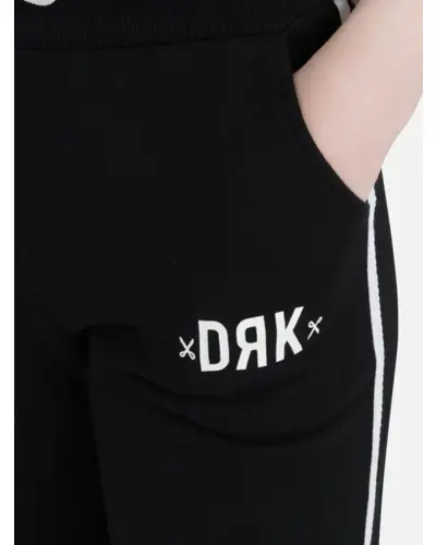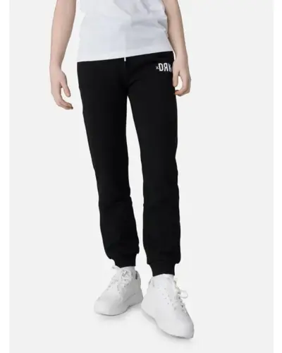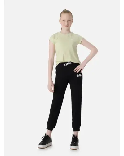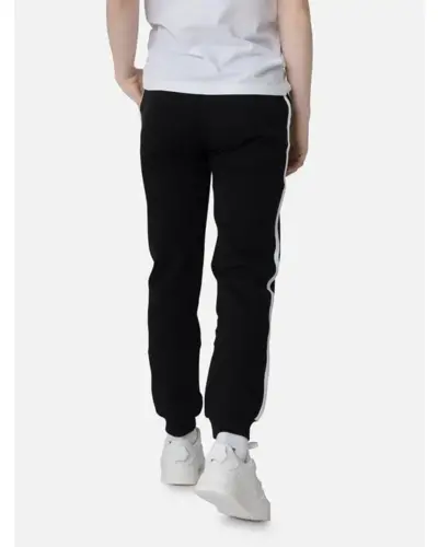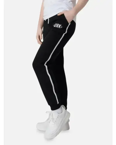 Kényelmes jogging nadrág lányoknak. Két zseb található rajta, oldalán beleszabott fehér dekorcsík helyezkedik el. A derékbőség szabályozózsinórral állítható. Összetétel: 60% pamut, 40% poliészter