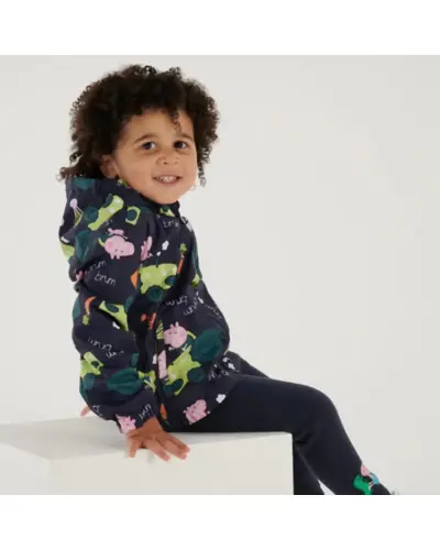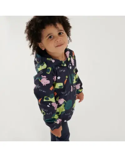 gyerek esőkabát, Hydrafort - vízálló 100% poliészter anyag, Ragasztott varrások, Tartós víztaszító felület, Teljes felületén mintás, Részben hálós, részben poliészter taft bélés, Gumis szegélyû, nem-levehető kapucni, Gumírozott mandzsetta, Két zseb az alján, Gumírozott alsó szegély, Fényvisszaverő berakásokkal
