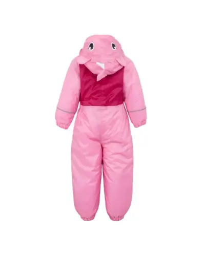 gyerek kezeslábas, vízálló és légáteresztő könnyû Isolite poliészter anyag, tartós víztaszító felület, hegesztett varrások, thermoguard hőszigetelő töltet, fix kapucni, állatfejes kapucni, polár bélés törzsön, kapucniban, rugalmas derékrész és mandzsetta, fényvisszaverő részek