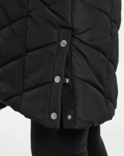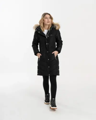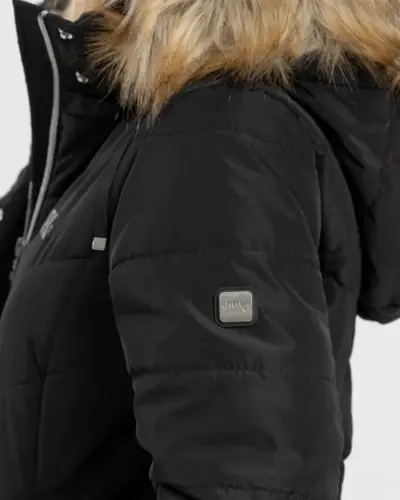 A NENA karcsúsított pufi télikabát 100% poliészter anyagból készült, stílusos és meleg választás a téli időszakra. A fényes guminyomatos logó és a bal felkaron található fémnyomat logó modern megjelenést ad, míg a logózott gombok és cipzár tovább emelik a kabát stílusát. A szőrmés kapucni levehető, így variálható a kabát viselése, a kötött passzé pedig kényelmes viseletet és extra védelmet biztosít a hideg ellen.