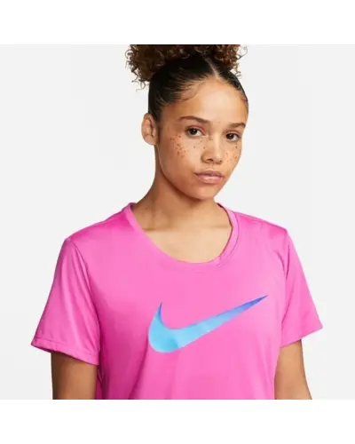 Light and breezy, the Nike Dri-FIT Swoosh Short-Sleeved Top takes a cue from our Nike One line by delivering an essential counterpart to your miles. With sweat-wicking fabric and side cutouts on the bottom hem, you\'ll stay cool as you heat things up. A supportive fit that glides with you as you move gives you a relaxed feel and casual look.