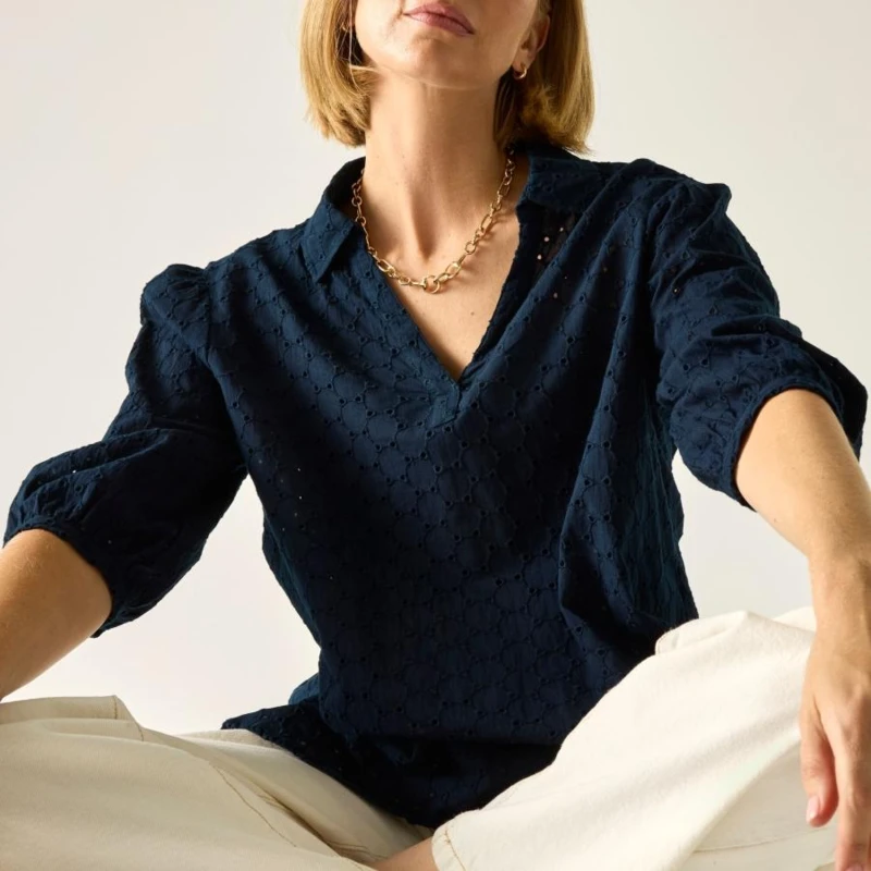 Női blúz, Prémium női könnyû nyári blúz broderie és pamut-len kombináció, laza szabás, Ez a női nyári blúz 100% pamut broderie anyagból készült, 120 g/m? súlyban, amelyet 90% pamut / 10% len fonalfestett csíkos, könnyû anyag egészít ki 90 g/m? kivitelben. A természetes szálösszetétel és a légies szerkezet kiváló komfortot biztosít meleg időben. A laza szabás és a nyitott galléros kialakítás könnyed, nőies megjelenést eredményez., Főbb jellemzők:, 100% pamut broderie anyag, 120 g/m?, 90% pamut / 10% len fonalfestett csíkos könnyû anyag, 90 g/m?, Nyitott gallér gombolópánttal, Laza, kényelmes szabás, Hosszított, ejtett alsó szegély, Könnyû, jól szellőző konstrukció, Ajánlott: Női nyári blúzként ideális mindennapi viselethez, utazáshoz, városi programokhoz és nyári kirándulásokhoz. Kiváló választás meleg, napos időben, amikor fontos a természetes anyag és a komfort., Fenntarthatóság: A természetes pamut és len alapanyag kellemes viseletet és megfelelő tartósságot biztosít. A minőségi kivitel hozzájárul a hosszabb élettartamhoz, csökkentve a gyakori ruhacsere szükségességét.