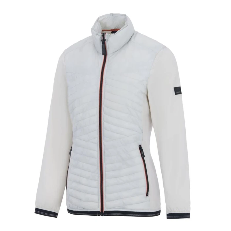 Női hybrid felső, Prémium női könnyû hibrid szigetelt kabát – Feather Free szigetelés, ISOFLEX stretch panelek, Ez a női technikai hibrid kabát 100% poliamid ultrakönnyû 20D külső anyagból készült, 37 g/m? súlyban, tartós vízlepergető bevonattal a törzsrészen. A prémium, újrahasznosított Feather Free szintetikus pehelytöltet 100 g/m? szigetelési súllyal megbízható hőkomfortot biztosít kis tömeg mellett. Az ISOFLEX active stretch panelek 86% poliamid / 14% elasztán összetételben, 130 g/m? kivitelben fokozzák a mozgásszabadságot és a kényelmet aktív használat során., Főbb jellemzők:, 100% poliamid ultrakönnyû 20D anyag, 37 g/m?, Tartós vízlepergető bevonat a törzsrészen, Prémium újrahasznosított Feather Free szintetikus pehelytöltet, Szigetelés súlya: 100 g/m?, ISOFLEX active stretch panelek, 86% poliamid / 14% elasztán, 130 g/m?, 2 alsó cipzáras zseb, Rugalmas szegély a mandzsettán és az alsó részen, Ajánlott: Női könnyû szigetelt kabátként ideális túrázáshoz, kiránduláshoz, utazáshoz és aktív szabadtéri programokhoz hûvösebb időben. Kiváló középrétegként vagy önálló kabátként átmeneti időszakban., Fenntarthatóság: Az újrahasznosított szintetikus szigetelés csökkenti a környezeti terhelést, miközben magas hőkomfortot biztosít. A könnyû és tartós anyaghasználat hosszú élettartamot garantál, mérsékelve a gyakori ruhacsere szükségességét.