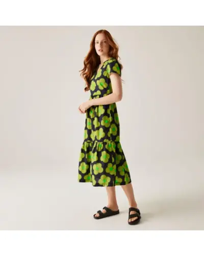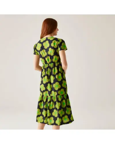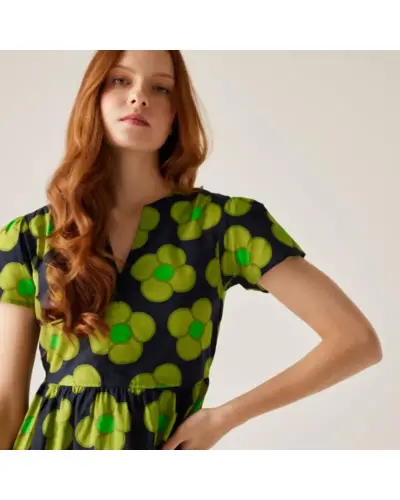 Női ruha, Anyag: 100% BCI pamut poplin (110 g/m?), puha és légáteresztő, Nyakkivágás: Elegáns V-nyakú kialakítás, Ujjak: Lágyan leomló „vízesés” ujjak, Szabás: Ráncolt, réteges panelek a légies esésért, Minta: Orla Kiely egyedi, teljes felületû nyomatai, Ez a könnyed, nőies ruha tökéletes választás meleg időre, legyen szó mindennapi viseletről vagy különleges alkalmakról. Kifinomult szabása és fenntartható anyaga egyszerre biztosít kényelmet és stílust.