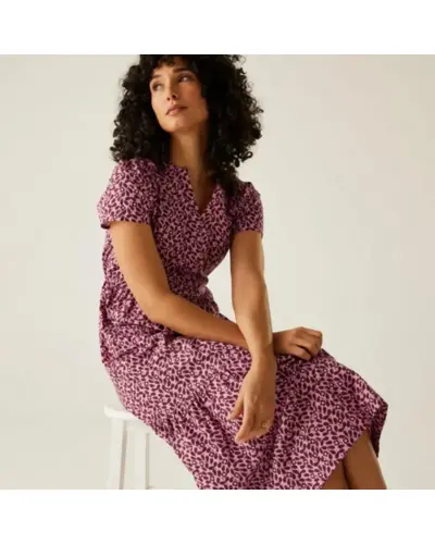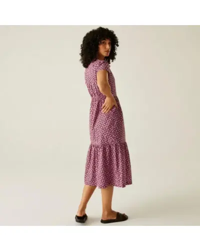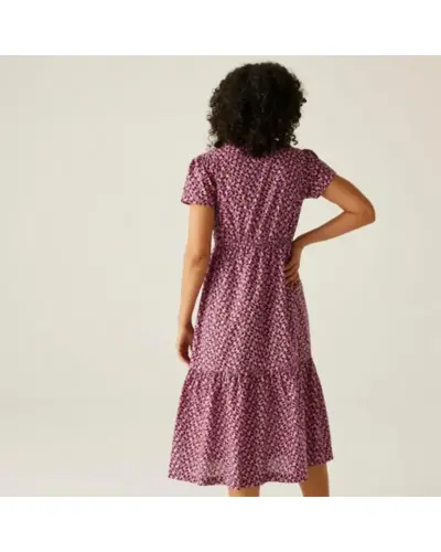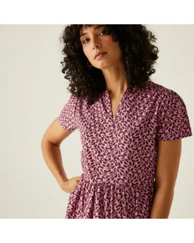 Női ruha, Anyag: 100% BCI pamut poplin (110 g/m?), puha és légáteresztő, Nyakkivágás: Elegáns V-nyakú kialakítás, Ujjak: Lágyan leomló „vízesés” ujjak, Szabás: Ráncolt, réteges panelek a légies esésért, Minta: Orla Kiely egyedi, teljes felületû nyomatai, Ez a könnyed, nőies ruha tökéletes választás meleg időre, legyen szó mindennapi viseletről vagy különleges alkalmakról. Kifinomult szabása és fenntartható anyaga egyszerre biztosít kényelmet és stílust.