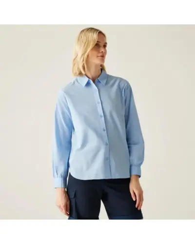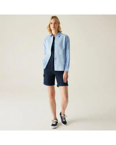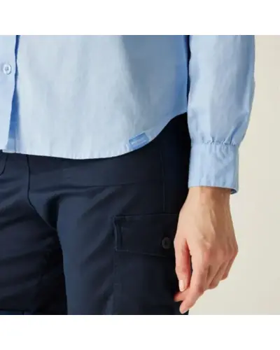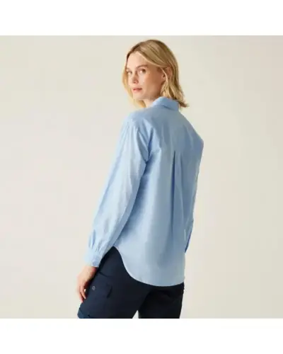 Női pamut-len blúz, Anyag:, 90gsm, 90% BCI pamut / 10% len, könnyû anyag, Tulajdonságok:, Relaxált szabás kényelmes és laza viselet, Lehajtott gallér állítóval elegáns, visszafogott stílus, Hosszú ujjú kialakítás klasszikus megjelenés, Lehulló alsó él modern, laza szabás, Koordinált kollekció: Primevere II (lap 101) és Sabela Shorts II (lap 111), Ideális választás mindennapi viselethez, ahol a kényelmet, a stílust és a minőségi anyaghasználatot értékelik.