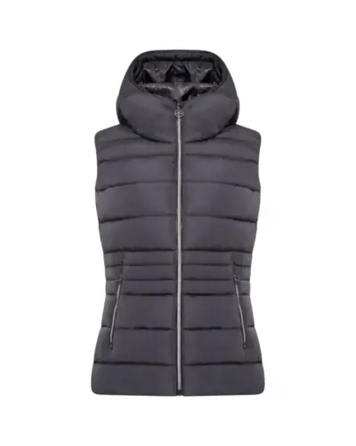 Női mellény, Poliészter selymes fényû anyag, Vízlepergető felület, Újrahasznosított anyagból készült meleg bélésanyag, Trendi steppelés, Funkcionális divat, Fém kiegészítő és kristályokkal díszített cipzárlehúzók, fix kapucni magas nyakrésszek, 2 x alsó kézmelegítő zseb , nyomott újrahasznosított bélés, 1 belső zseb