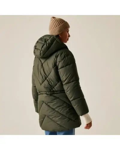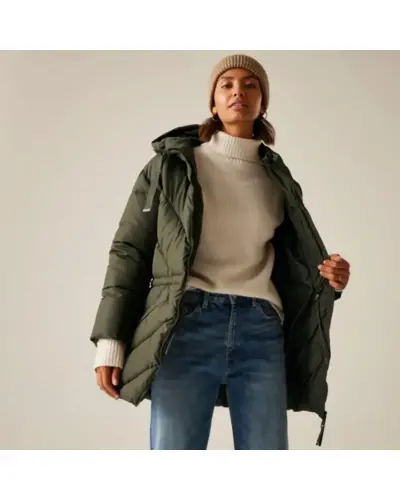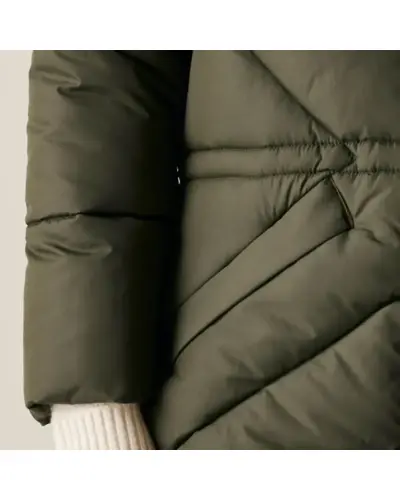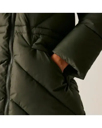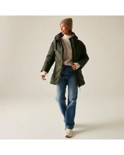 Női bélelt kabát, Könnyed melegség, sportos stílusban – újrahasznosított anyagokból, Ez a modern női télikabát a funkcionalitás és divat tökéletes egyensúlyát kínálja. A mikro taslan poliészter szövet (85 g/m?) rendkívül könnyû, ugyanakkor strapabíró, a tartós vízlepergető bevonat pedig hatékonyan véd az időjárás viszontagságaitól., A kabát szíve a 250g-os Warmloft újrahasznosított szintetikus pehelyhatású szigetelés, amely pehely érzetet biztosít anélkül, hogy állati eredetû lenne – így melegen tart a leghidegebb napokon is. A 100% poliészter taffeta bélés puha érzetet nyújt viselés közben, a belső cipzáras zseb pedig praktikus megoldás értékeid biztonságos tárolására., A fix kapucni karakteres vonalat kölcsönöz a megjelenésnek, amit a díszes húzózsinór és az állítható derékrész még nőiesebbé tesz. A két alsó cipzáras zseb a kényelem mellett a letisztult dizájn része., ? Könnyû, mégis meleg, ? Modern, sportos fazon, ? Környezetbarát anyaghasználat