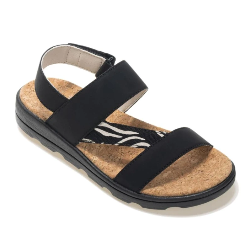 Női szandál, Prémium női szandál parafa hatású talpbetéttel, könnyû EVA/TPR talppal, Ez a női szandál minőségi szintetikus bőr felsőrésszel készült, amely letisztult, időtálló megjelenést biztosít. A parafa hatású EVA talpbetét kényelmes alátámasztást nyújt egész napos viselet során, míg a könnyû, mégis strapabíró talpszerkezet stabil tapadást garantál., Főbb jellemzők:, Minőségi szintetikus bőr felsőrész, EVA parafa hatású talpbetét az egész napos komfortért, Könnyû és kopásálló, fröccsöntött EVA/TPR külső talp a megbízható tapadásért, Stabil, kényelmes kialakítás, Ajánlott:, Nyári mindennapokra, utazáshoz, városi sétákhoz és szabadidős programokhoz. Ideális választás nők számára, akik kényelmes, könnyû és jól kombinálható szandált keresnek., Fenntarthatóság:, Tartós kialakítása hosszú élettartamot biztosít, amely hozzájárul a felelős termékhasználathoz és a csökkentett környezeti terheléshez.