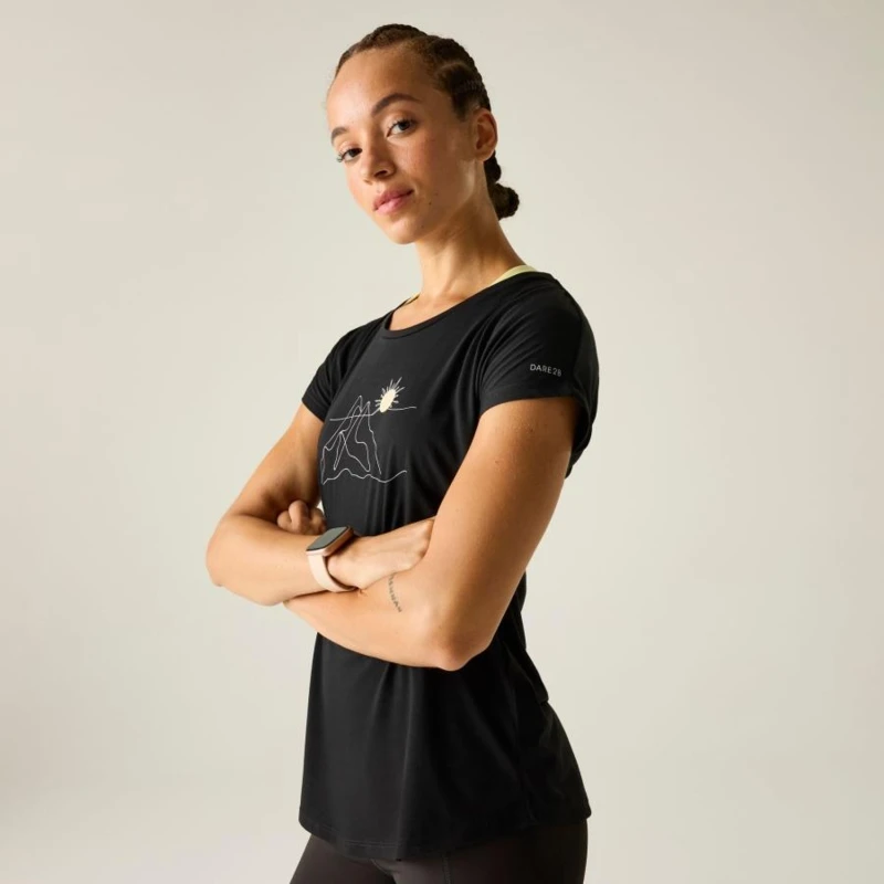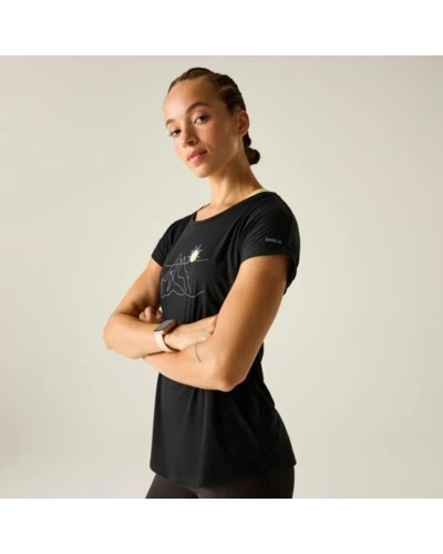 Női gyorsan száradó póló, Prémium női könnyû póló újrahasznosított poliészterlyocell, légáteresztő kivitel, Ez a női póló 80% újrahasznosított poliészter és 20% lyocell keverékéből készült, puha tapintású és jól szellőző anyagból. A könnyû szerkezet kellemes komfortérzetet biztosít egész napos viselet során, míg a grafikai nyomat modern, sportosan nőies megjelenést kölcsönöz., Főbb jellemzők:, 80% újrahasznosított poliészter / 20% lyocell könnyû, légáteresztő anyag, Grafikai nyomott részlet, Kerek nyakkivágás, Puha, komfortos viselet mindennapi használatra, Ajánlott: Női pólóként ideális hétköznapi viselethez, utazáshoz, városi programokhoz és könnyed szabadtéri tevékenységekhez. Kiváló választás, ha fontos a légáteresztés és a kényelmes, természetes érzet., Fenntarthatóság: Az újrahasznosított poliészter csökkenti a környezeti terhelést, a lyocell pedig természetes eredetû, kellemes viseletet biztosító szál. A tartós konstrukció hosszú élettartamot tesz lehetővé.