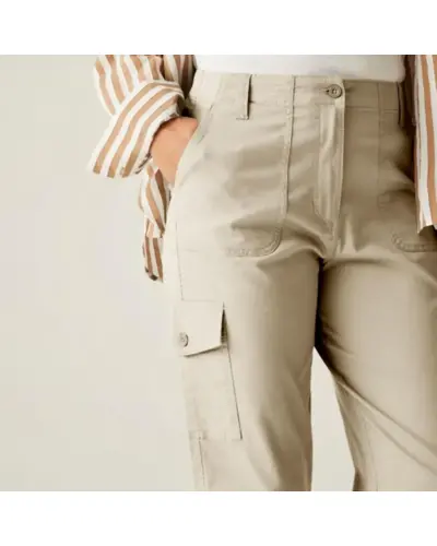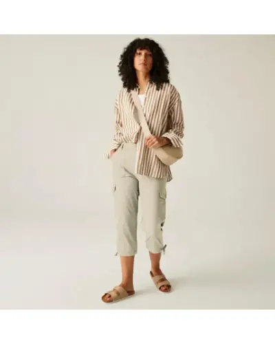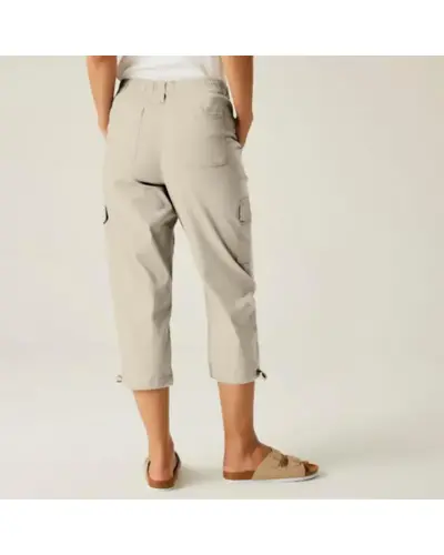 Női capri nadrág, Anyag:, 210gsm, 56% viszkóz / 40% BCI pamut / 4% elasztán twill anyag, Tulajdonságok:, Részben elasztikus derékrész a kényelmes illeszkedésért, Többzsebös kialakítás: elülső, oldalsó és hátsó zsebek, Garment washed kivitel – puhább tapintás és vintage megjelenés, Felfelé fordított alsó él, UV-védelem (UPF 50+), Ideal választás mindennapi viselethez, ötvözve a kényelmet, a funkcionalitást és a stílust.