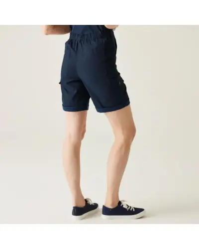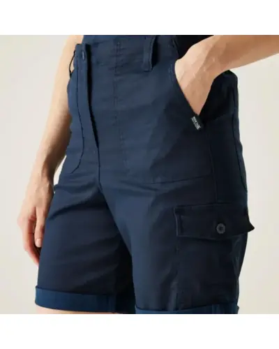 Női short, 210gsm, 56% viszkóz / 40% BCI pamut / 4% elasztán twill anyag, Részben elasztikus derékrész a kényelmes illeszkedésért, Többzsebes kialakítás: elülső, oldalsó és hátsó zsebek, Garment washed kivitel – puhább tapintás és vintage megjelenés, Felfelé fordított alsó él (turn up hem), UV-védelem (UPF 50+) – maximális védelem a káros napsugarakkal szemben