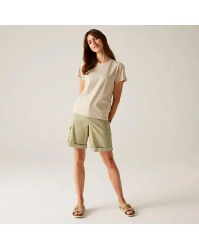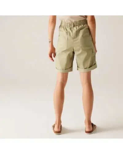 Női short, 210gsm, 56% viszkóz / 40% BCI pamut / 4% elasztán twill anyag, Részben elasztikus derékrész a kényelmes illeszkedésért, Többzsebes kialakítás: elülső, oldalsó és hátsó zsebek, Garment washed kivitel – puhább tapintás és vintage megjelenés, Felfelé fordított alsó él (turn up hem), UV-védelem (UPF 50+) – maximális védelem a káros napsugarakkal szemben