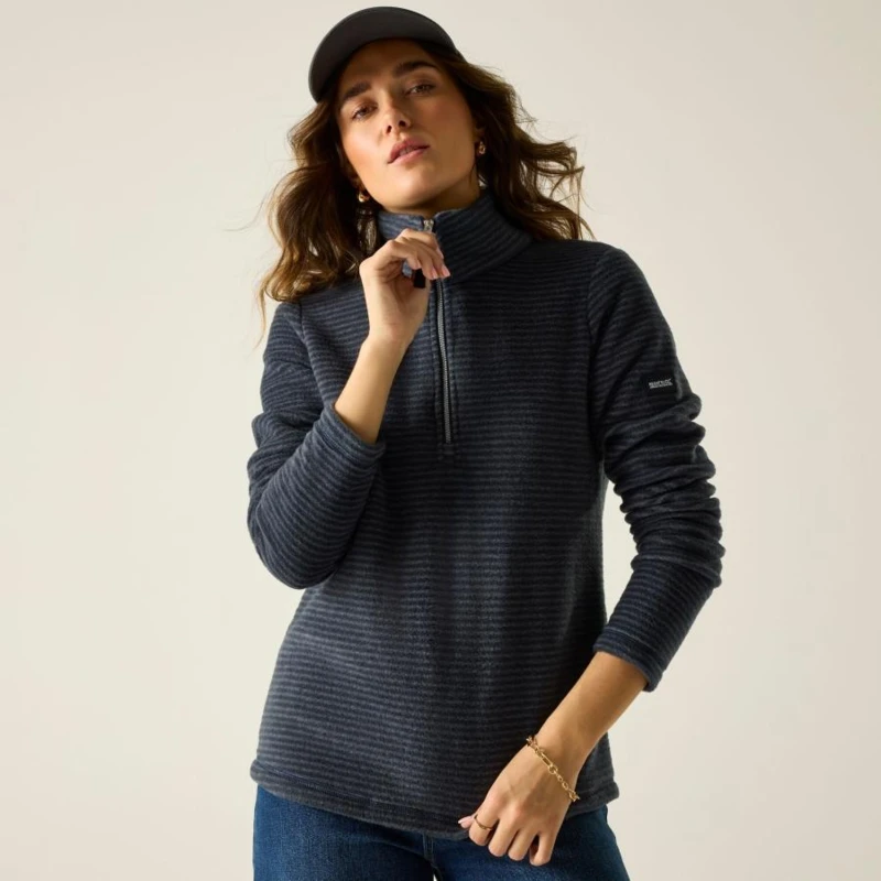 Női polár pulóver, 220gsm, 88% újrahasznosított poliészter / 12% pamut csíkos polár, 1/4 hosszú cipzáros kialakítás, Újrahasznosított tartalommal készült