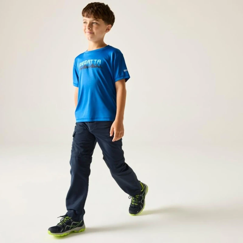 Gyerek túranadrág, Prémium gyerek könnyû túranadrág zip-off kialakítás, gyorsan száradó, UPF 50+, 105 g/m?, Ez a gyerek technikai nadrág 100% poliészter könnyû, szőtt anyagból készült, 105 g/m? súlyban. A gyûrődésálló, gyorsan száradó konstrukció ideális aktív szabadtéri használatra. A lecipzározható száraknak köszönhetően a nadrág rövidnadrággá alakítható, így változékony időjárási körülmények között is sokoldalú megoldást kínál., Főbb jellemzők:, 100% poliészter könnyû szőtt anyag, 105 g/m?, Gyûrődésálló kivitel, Gyorsan száradó konstrukció, Elasztikus derékrész belső gombos állítóval, Többzsebes kialakítás, Fényvisszaverő részletek, Lecipzározható szár, amely shorttá alakítható, UPF 50+ UV-védelem, Ajánlott: Gyerek túranadrágként ideális kiránduláshoz, táborozáshoz, utazáshoz és aktív szabadtéri programokhoz. Kiváló választás, ha fontos a variálhatóság, a gyors száradás és a napvédelem., Fenntarthatóság: A strapabíró poliészter anyag hosszú élettartamot biztosít, ellenáll az intenzív igénybevételnek. A minőségi kivitel csökkenti a gyakori ruhacsere szükségességét.