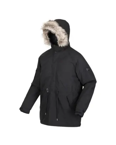 férfi télikabát, Hydrafort - vízálló 100% poliészter anyag, Hydrafort - vízálló, cirmos, nyomott 100% poliészter anyag, Ragasztott varrások, Tartós víztaszító felület, Thermo-Guard hőszigetelés, Poliészter bélés sherpa betétekkel a testen és a kapucnin, Biztonsági belső zsebbel, Állítható, nem-levehető kapucni, Állítható mandzsetta, Két kézmelegítős zseb az alján, Húzózsinórral állítható alsó szegély