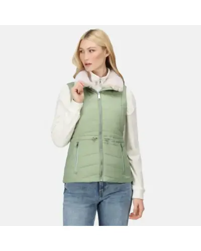 Női mellény, 100% poliamid anyag vízlepergető és viaszos bevonattal, Tartós vízlepergető felület, Szintetikus Warmloft tapintású belső szigetelés, 100% poliészter taft bélés, szőrmés belső gallér, Húzózsinórral állítható derékrész, 2 alsó zseb