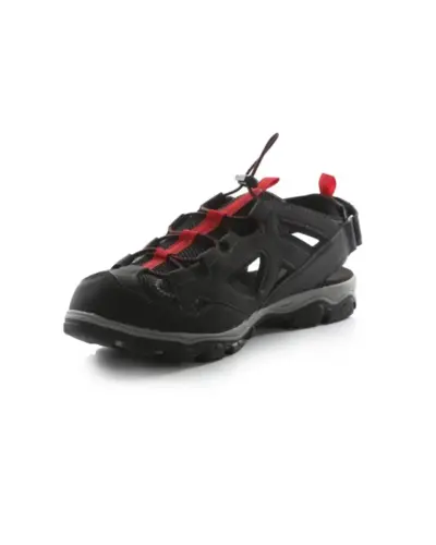 férfi szandál, Poliuretán és a légáteresztő hálós felsőrész, Spandex bélés az extra kényelemért , Gumival megerősített orrész, Húzózsinórral állítható bőség, Tépőzárral állítható sarok, Textil borítású talp, Könnyû, csúszásmentes, tartós TPR talp