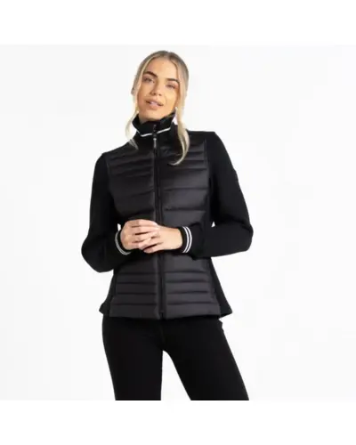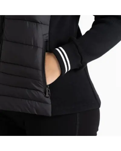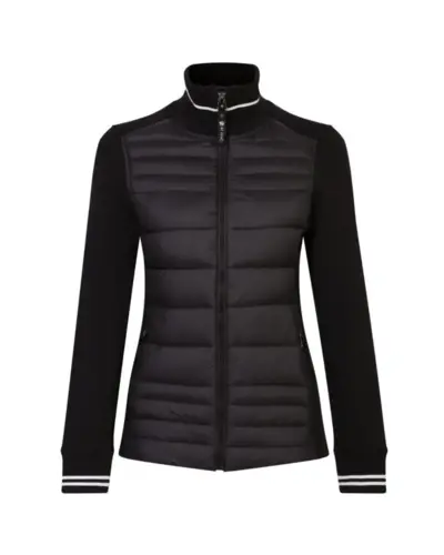 Női steppelt felső, Újrahasznosított nylon/poliészter keverék anyag, steppelt mellső nylon/poliészter keverékből, Az ujjak és a hátsó test poliészter/elasztán, Újrahasznosított, magas hőmérsékletet tartó töltet – ILoft Ecofill, Bordás gallér, szegély és mandzsetta, 2 x alsó cipzáras zseb