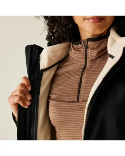 Női 3 in 1 kabát 15000 mm, Női 3 az 1-ben technikai kabát  vízálló külső, meleg polár bélés, Ez a sokoldalú kabátkombináció ideális választás a változékony időjáráshoz. A vízálló, rugalmas külső réteg maximális védelmet nyújt az eső és szél ellen, míg a 170 g-os mikropolár bélés kellemes meleget biztosít hûvösebb napokon. A két réteg együtt vagy külön is hordható, így egész évben alkalmazkodik az időjáráshoz., Külső kabát  Rugalmas védelem az elemek ellen:, Isotex 15000 stretch anyag  100% poliészter, 165 g/m?, Lélegzőképesség: 15 000 g/m?/24 óra, Tartós vízlepergető kezelés + ragasztott varrások, Beépített állítható kapucni, Középső cipzár vízelvezető csatornával, 2 alsó cipzáras zseb + belső biztonsági zseb, Előformázott ujjak a jobb mozgásszabadságért, Állítható mandzsetta és alsó szegély húzózsinórral, Belső kabát  kényelmes, puha mikropolár bélés:, 100% poliészter mikropolár  170 g/m?, 2 alsó zseb, Rugalmas szegély a galléron és mandzsettákon, Levehető kapucni húzózsinóros állítással, Újrahasznosított anyagok felhasználásával készült, ? Ajánlott: egész napos kültéri tevékenységekhez, kiránduláshoz, munkába járáshoz és városi használatra., ?? Funkcionalitás, komfort és környezettudatosság  tökéletes egyensúlyban.