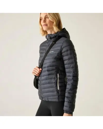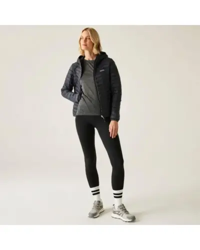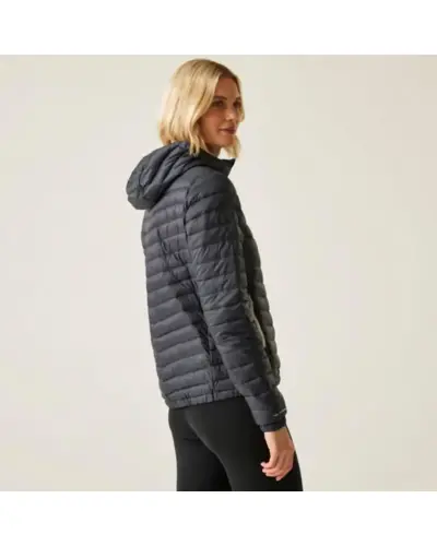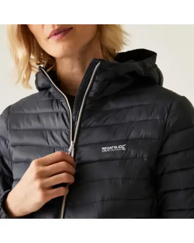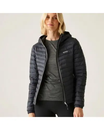 Női könnyû vékony steppelt kabát, Anyag:, 38gsm könnyû, 100% poliamid mikro ripstop szövet magas fényû felülettel, Tulajdonságok:, Tartós vízlepergető bevonat, Feather Free – prémium, újrahasznosított szintetikus pehelyszigetelés, Közepes töltet – 140gsm, Poliamid bélés, Beépített kapucni, Elülső közép részén piping részlet, 2 cipzáras alsó zseb, Újrahasznosított tartalommal készült