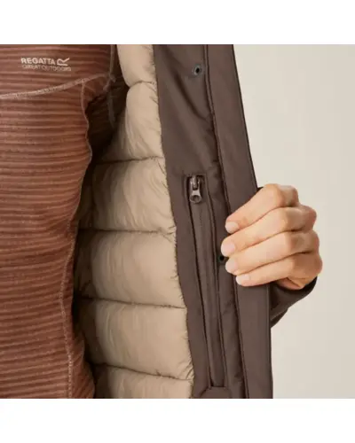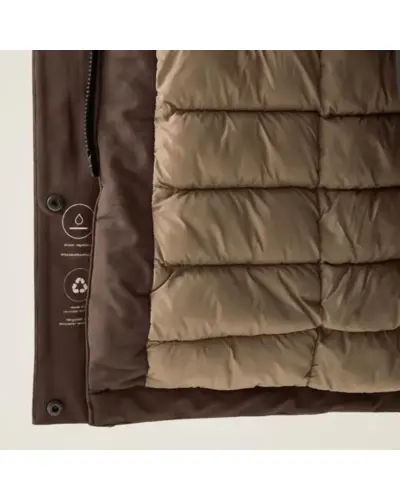 Női vízálló bélelt kabát, Újrahasznosított 100% poliészter vízlepergető stretch anyag:, Az újrahasznosított poliészter anyag környezetbarát, A vízlepergető tulajdonság segít abban, hogy az eső ne áztassa át a kabátot., A stretch anyag kényelmet és mozgásszabadságot biztosít., A membrán technológia biztosítja a víz- és szélállóságot, miközben lehetővé teszi a légáteresztést,,  hogy a nedvesség kifelé távozzon., Közepes súlyú, tollmentes prémium újrahasznosított szintetikus pehelyszigetelés:, A szintetikus pehelyszigetelés melegen tart, anélkül, hogy állati eredetû anyagokat használnánk., Az újrahasznosított anyagok használata fenntarthatóbb megoldás., A poliamid bélés tartós és kopásálló, emellett kényelmes viseletet biztosít., Belső cipzáras biztonsági zseb:, Biztonságos tárolási lehetőséget nyújt a fontos tárgyak, például pénztárca vagy mobiltelefon számára., Az állítható kapucni extra védelmet nyújt az eső és szél ellen, valamint személyre szabható illeszkedést biztosít., Kétirányú középső elülső cipzár:, A kétirányú cipzár lehetővé teszi a szellőztetést és a mozgás szabadságát anélkül, hogy a kabátot teljesen ki kellene nyitni., Két alsó cipzáras zseb:, Praktikus tárolóhelyet biztosít a kisebb tárgyak számára, amelyeket könnyen elérhetsz., Belső Lycra mandzsetták:, A Lycra mandzsetták kényelmesek és megakadályozzák, hogy a hideg levegő bejusson a kabát ujjain keresztül., Ez a kabát ideális lehet túrázáshoz, városi közlekedéshez vagy bármilyen szabadtéri tevékenységhez, , ahol szükség van víz- és szélálló védelemre.
