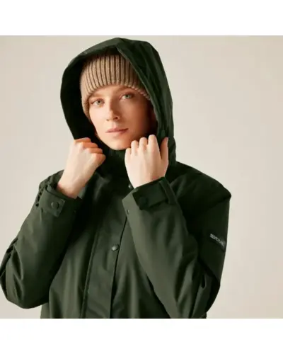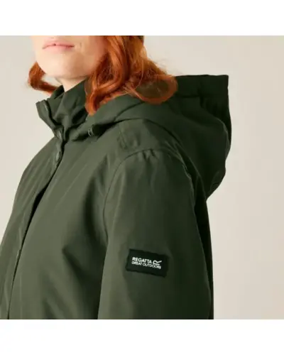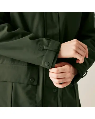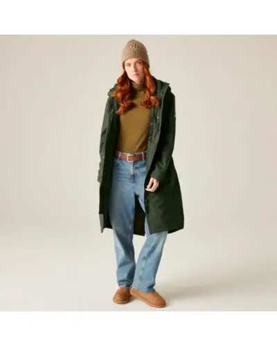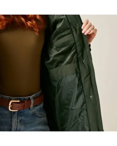 Női bélelt kabát 10000 mm, Női peached hatású, vízálló télikabát elegáns megjelenés, meleg védelem, Ez a puha tapintású, mégis strapabíró női kabát nemcsak stílusos, de minden szempontból praktikus választás hûvös, csapadékos napokra. A vízálló, légáteresztő Isotex 10000 újrahasznosított poliészter anyag kiváló védelmet biztosít, míg a könnyû 100 g-os Thermoguard szigetelés kényelmes meleget ad anélkül, hogy túl vastag lenne. A levehető mûszőrmés kapucni és a karcsúsítható derékrész nőies megjelenést kölcsönöz, a polárbéléses kapucni pedig extra komfortot biztosít., Anyag: újrahasznosított peached poliészter Isotex 10000 (110 g/m?), Légáteresztés: 10,000 g/m?/24 óra, Ragasztott varrások teljes vízállóság, 100 g/m? újrahasznosított Thermoguard szigetelés, Polárbéléses kapucni, levehető mûszőrmével, Állítható derék húzózsinórral karcsúsított szabás, 2 nagy patch zseb + belső cipzáras biztonsági zseb, Tépőzáras, állítható mandzsetták, 100% poliészter taffeta bélés, Környezetbarát újrahasznosított anyagból készült, ? Tökéletes társ: városi sétákhoz, hétköznapokra és hideg, esős időjárásra, ?? Stílusos, meleg és fenntartható minden szempontból jó választás.